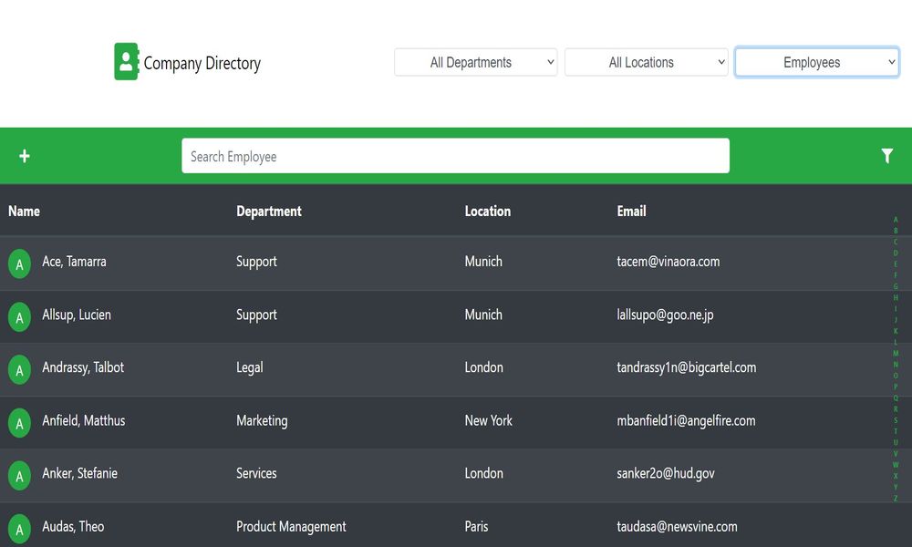 - Company Directory- The Company Directory is a single page CRUD application, that works well across desktop, tablet and mobile devices. The Company Directory allows users to create, read, update and delete employee, department and location records within the Company Directory.